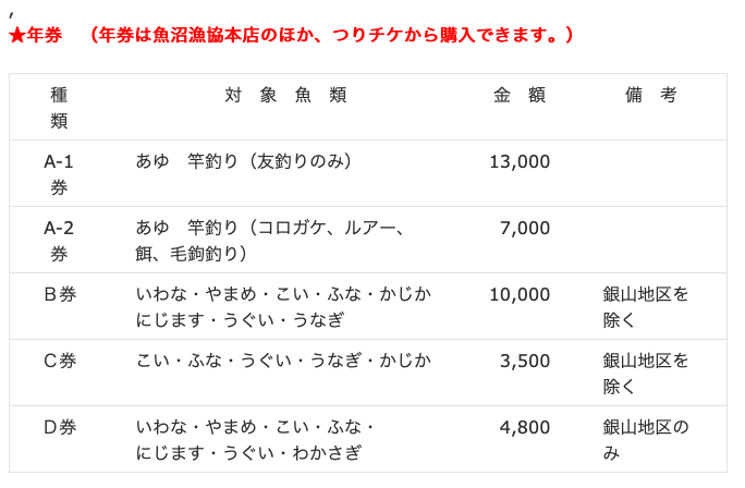 鮎の年券が友釣りとコロガシで料金が分けられています